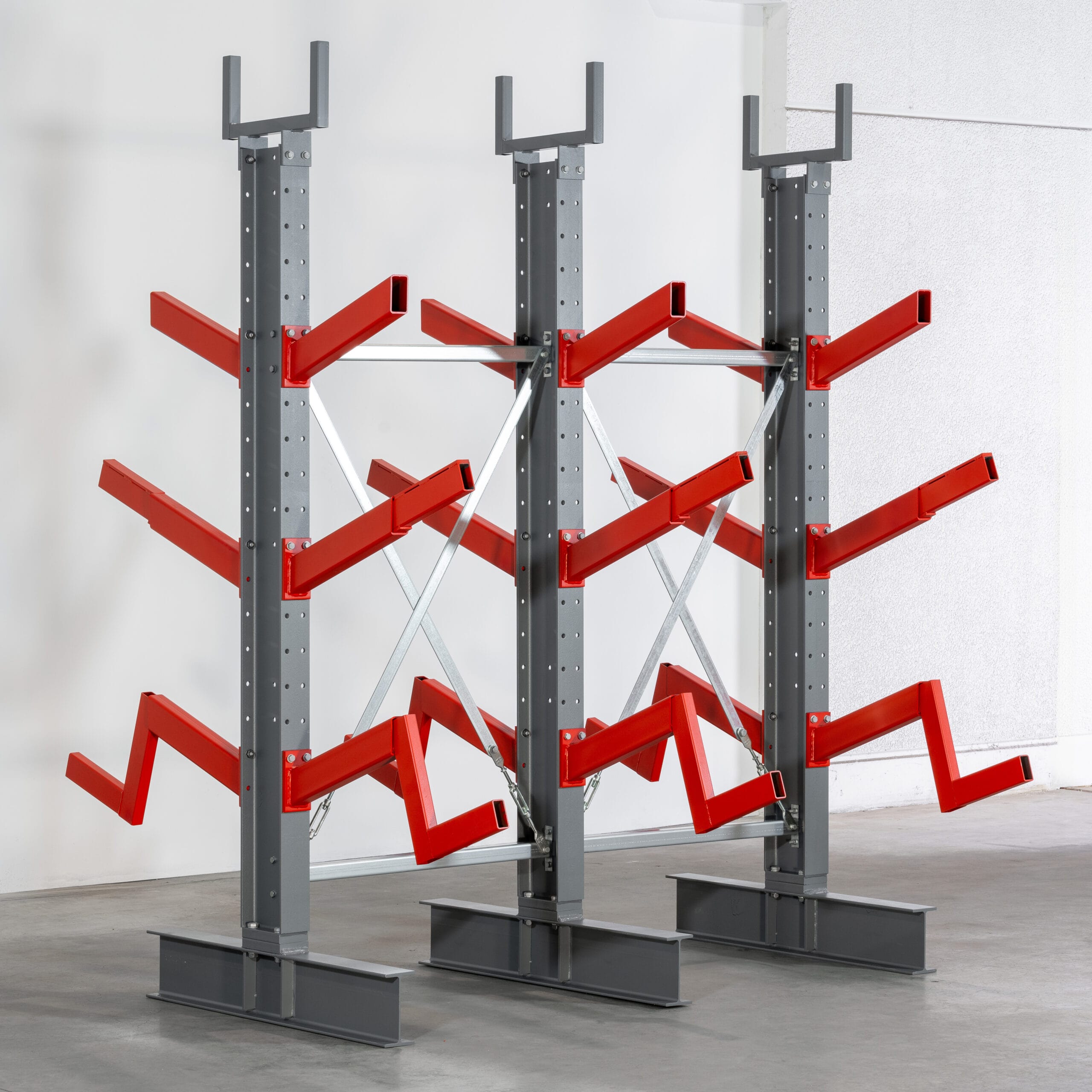 Unsere Schrägarmregale bestehen aus feuerverzinktem Stahl, das für hohe Stabilität und Langlebigkeit sorgt.