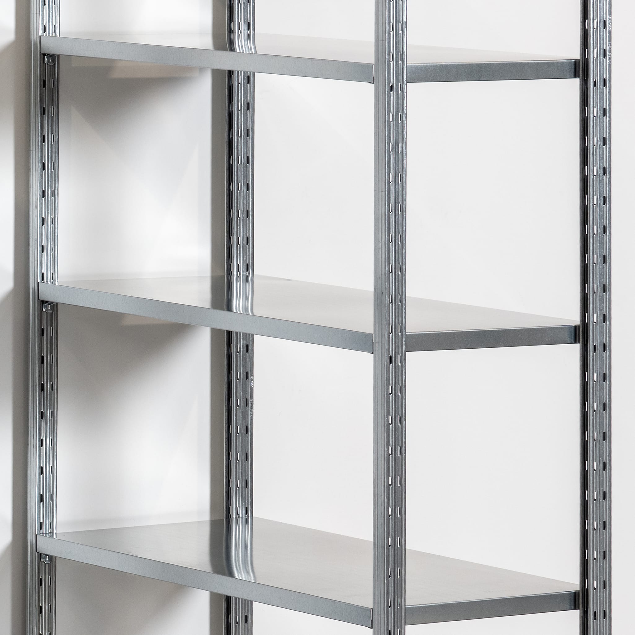 Nahaufnahme von Raecks Fachbodenregal in verzinkt, mit verzinkten Stahlträgern mit metallisch glänzender Oberfläche und präzisen Verbindungen - die perfekte Verstärkung für Regalgestelle.